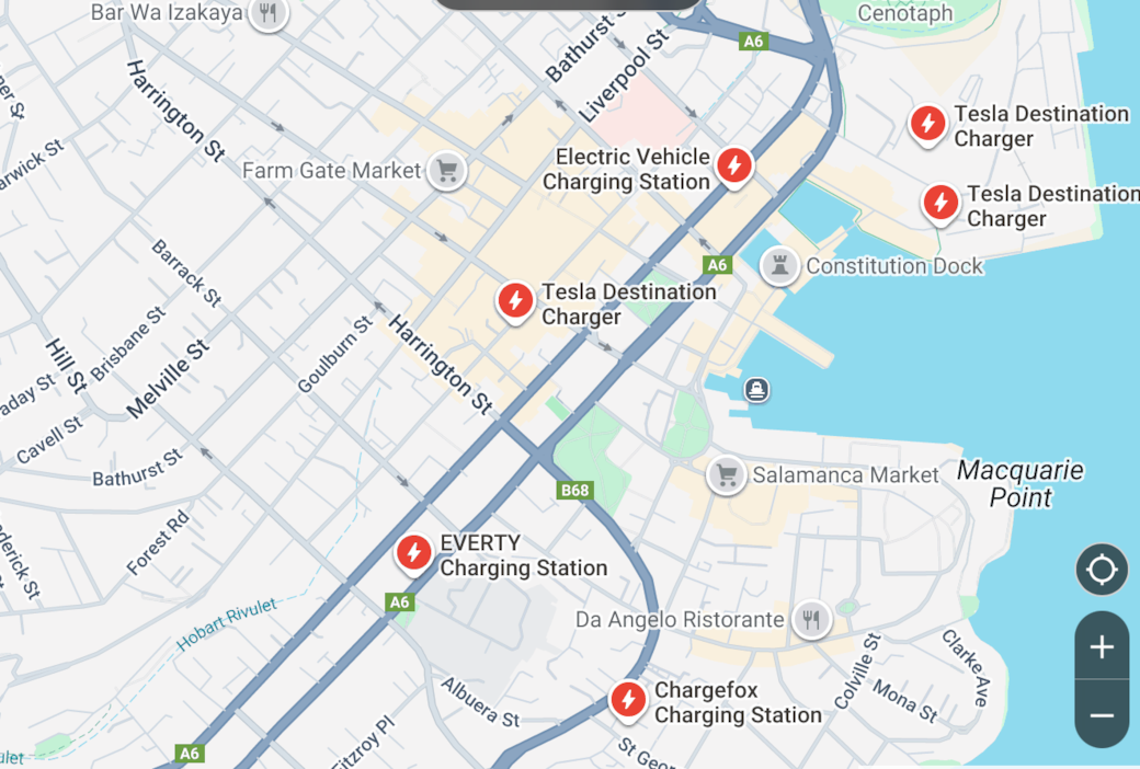 There a number of EV charging stations in the Hobart City area. Unfortunately we don't have one onsite. See the map below for locations.